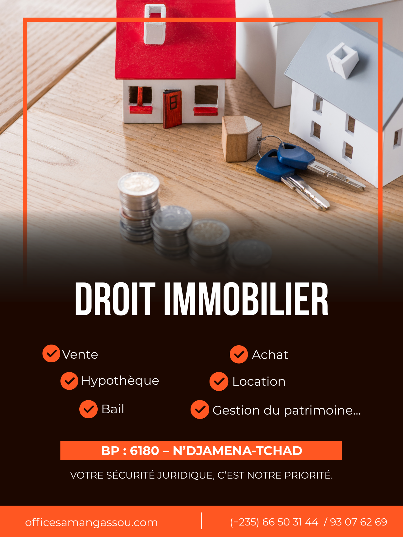 - L’immobilier: vente immobilière et mobilière, achat mobilier et immobiliers, conseil et accompagnement, gestion des aspects financier, publication et conservation des actes…